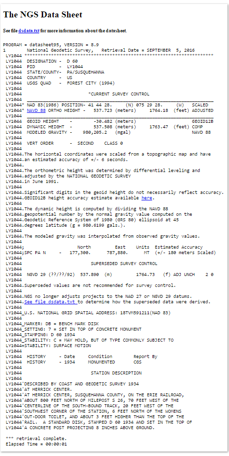 These two information literacy concepts inevitably converge on a third, “Authority is Constructed and Contextual,” which states that “Information resources reflect their creators’ expertise and credibility, and are evaluated based on the information need and the context in which the information will be used.” ((Ibid.)) In the case of the NSRS datasheet, the creation of the information is a collaborative yet situated act, in which many contributors over time construct the narrative log for that survey mark, and yet there is a communally shared understanding of which contributions are likely to be more reliable and hold more authority within the community that uses the database, which includes professional surveyors as well as recreational survey mark hunters.
