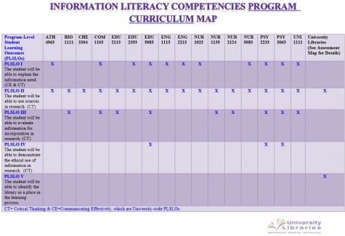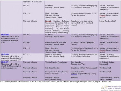 The University Libraries is a unique entity in comparison to the other academic units represented across campus. This is largely because information literacy is not a core curriculum requirement. As a result, some of the PLSLOs reflected on the assessment map include data collected outside of the traditional classroom that is specific to the services, resources, and educational opportunities that we facilitate. This is best demonstrated by PLSLOs two and five. For example, we know that students outside of our sessions are using the LibGuides and databases, which are integral to PLSLO two – “The student will be able to use sources in research.” For PLSLO five – “The student will be able to identify the library as a place in the learning process” we are not predominantly interested in whether or not students are using our electronic classrooms during an information literacy session. We are interested in students’ awareness and use of the physical and virtual library as a whole, so we are assessing student learning by whether or not students can find what they need on the University Libraries’ website or whether they utilize the University Libraries’ physical space in general.